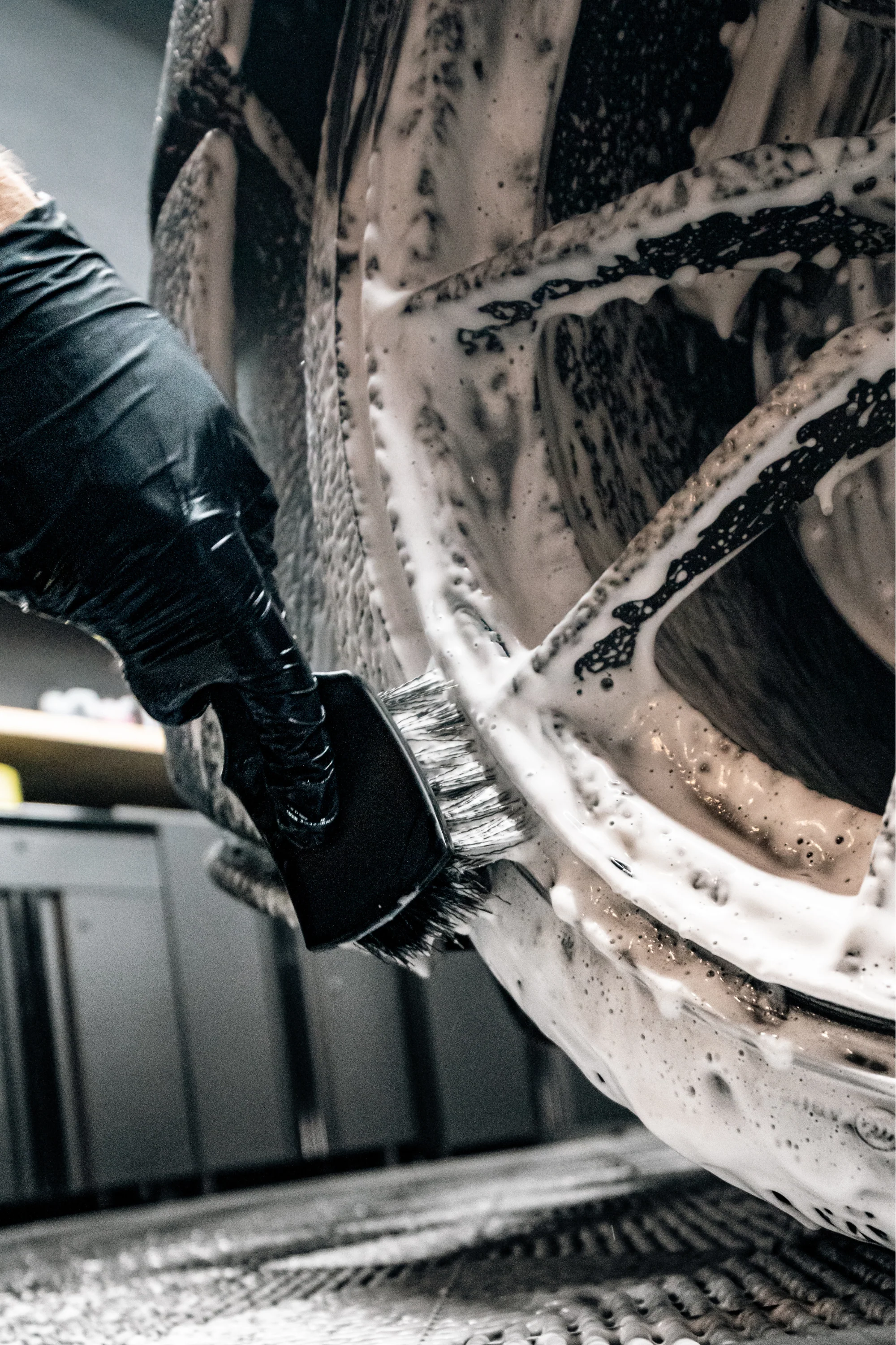 The Blackline Stiff Bristle Brush excels at penetrating embedded dirt, grime, and debris from tires, rubber floor mats, and carpets. It effectively agitates the surface, ensuring a thorough clean without causing damage to the surface. Its long bristles also serves as a creative tool for making unique carpet designs.